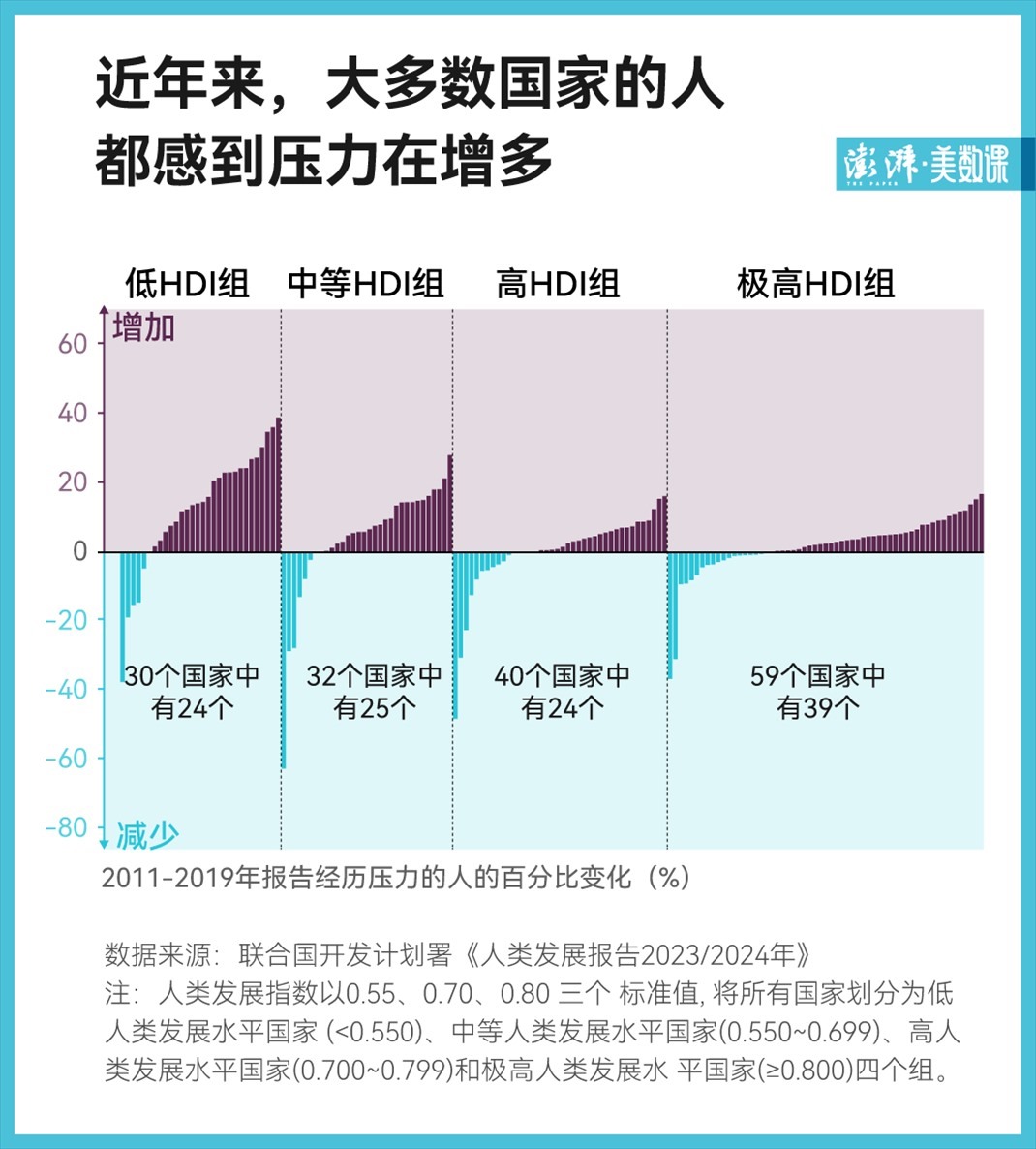 但其中低人類發(fā)展水平組、中人類發(fā)展水平組中,有約 80% 的國家個人壓力上升,且上升幅度較大,而高人類發(fā)展水平組和極高人類發(fā)展水平組的個人壓力上升幅度相對較小,這意味著欠發(fā)達(dá)國家的居民將面臨更大的壓力。