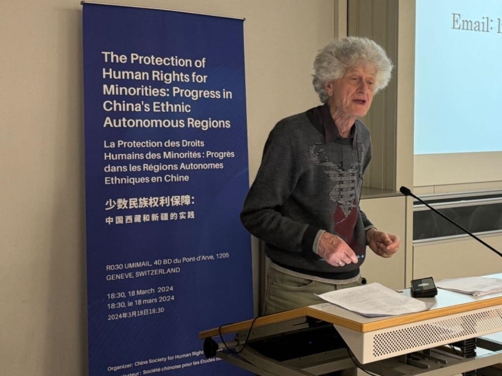 ?3月18日,由中國人權(quán)研究會(huì)主辦的“少數(shù)民族權(quán)利保障:中國西藏和新疆實(shí)踐”主題講座在瑞士日內(nèi)瓦舉行。圖為比利時(shí)知名藏學(xué)家安德烈·拉克魯瓦在講座上發(fā)言。新華社記者石松攝