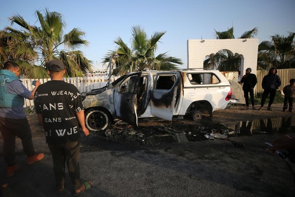 ?4月2日,在加沙地帶中部代爾拜拉赫,巴勒斯坦人在空襲過后查看被毀的汽車。巴勒斯坦紅新月會(huì)2日發(fā)表聲明說,以色列軍隊(duì)1日晚空襲加沙地帶中部城市代爾拜拉赫,造成慈善組織“世界中央廚房”7名工作人員死亡。新華社發(fā)(亞西爾·庫迪攝)