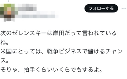 還有人說道:“有人說下一個(gè)澤連斯基是岸田。對美國來說,戰(zhàn)爭是賺錢的時(shí)機(jī),掌聲還是會(huì)給你的?!?/p>
