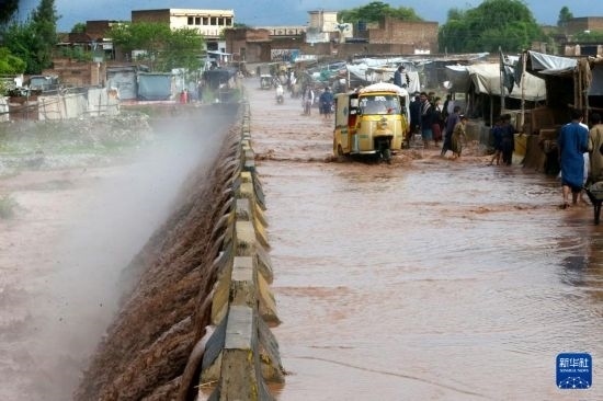 4月15日,在巴基斯坦西北部城市白沙瓦,車輛涉水前進。新華社發(fā)(奧馬爾·卡尤姆攝)