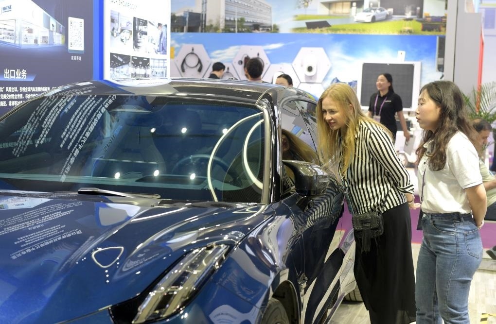4月15日,采購(gòu)商在第135屆廣交會(huì)上參觀新能源汽車。新華社記者盧漢欣攝