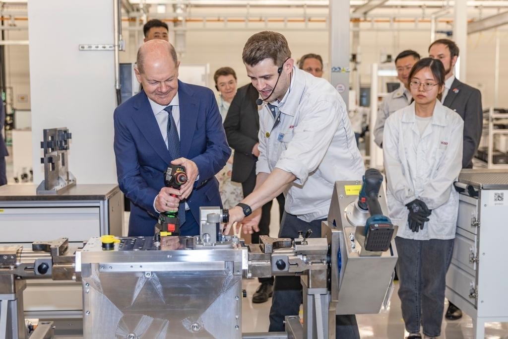 4月14日,德國總理朔爾茨在位于重慶市九龍坡區(qū)的博世氫動(dòng)力系統(tǒng)(重慶)有限公司參訪。