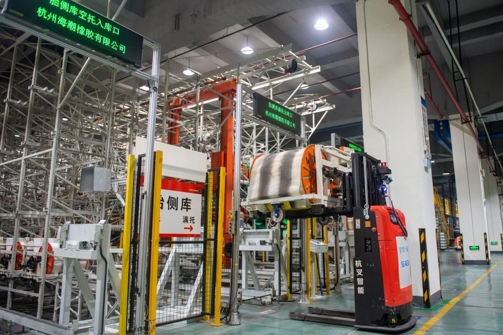 ?在杭州市錢(qián)塘區(qū)中策橡膠集團(tuán)股份有限公司未來(lái)工廠內(nèi),無(wú)人叉車在運(yùn)輸產(chǎn)品(2024年2月23日攝)。新華社記者 江漢 攝