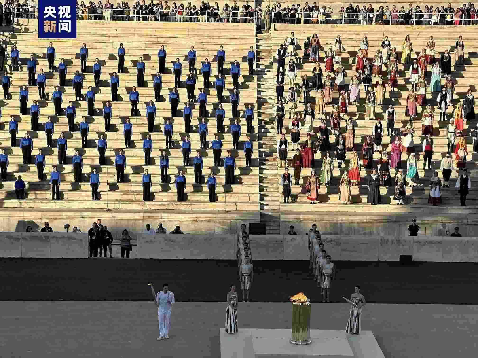 當(dāng)?shù)貢r(shí)間4月26日,在巴黎奧運(yùn)會(huì)火種交接儀式現(xiàn)場(chǎng),巴黎奧運(yùn)會(huì)希臘境內(nèi)最后一棒火炬手、希臘男子國(guó)家水球隊(duì)隊(duì)長(zhǎng)揚(yáng)尼斯·豐圖利斯點(diǎn)燃了會(huì)場(chǎng)的火種盆,完成了火炬在希臘境內(nèi)的傳遞。(總臺(tái)記者 楊明交)