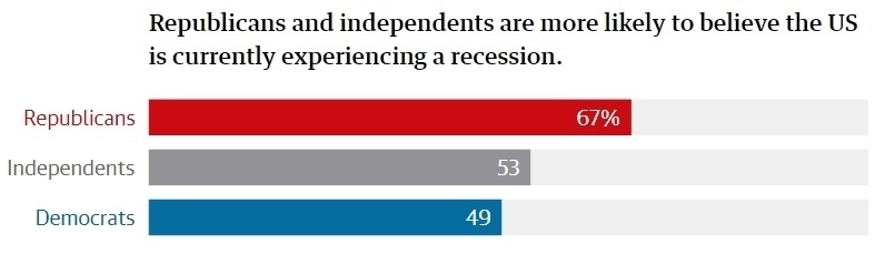 哈里斯民調(diào)公司進行的民調(diào)顯示,67%的共和黨人認為,美國經(jīng)濟正在萎縮,通貨膨脹正在加劇,整體經(jīng)濟正在惡化;而民主黨人中持相同觀點的人只有49%;此外,共和黨人比民主黨人更加相信,拜登政府的管理不善導致經(jīng)濟惡化。