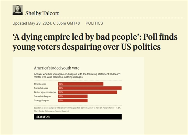 中國日報網(wǎng)5月30日電 當(dāng)?shù)貢r間29日,美國媒體Semafor網(wǎng)站報道,民主黨戰(zhàn)略組織“Blueprint”公布的一項最新民意調(diào)查顯示,美國18歲至30歲的選民中至少有一半人對美國的政治制度持負面看法,其中超過60%的人認(rèn)為美國正在衰落。