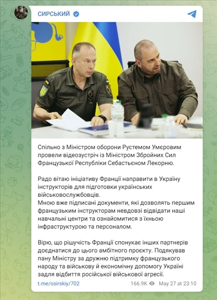 5月27日,瑟爾斯基在Telegram上發(fā)文稱,法國有意向?yàn)蹩颂m派遣教官,培訓(xùn)烏軍人員。
