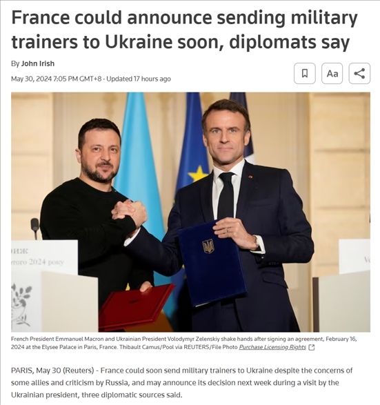 5月30日,路透社援引三位匿名外交消息人士稱,盡管仍有顧慮,但法國可能很快會向?yàn)蹩颂m派遣軍事教官,并可能在下周烏克蘭總統(tǒng)訪問期間宣布這一決定。