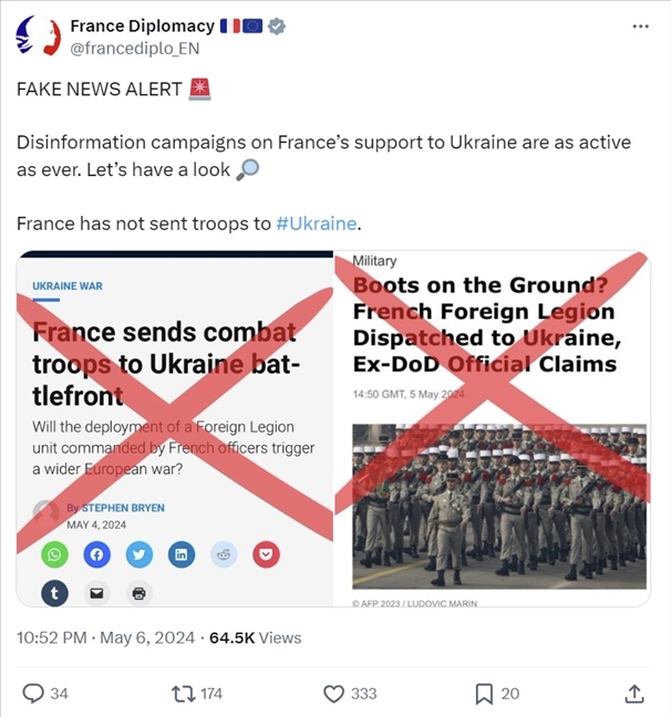 5月6日,法國外交部在X平臺上明確表示,“法國還沒有向?yàn)蹩颂m派兵。”