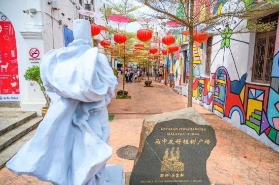 這是2019年12月20日在馬來(lái)西亞馬六甲拍攝的鄭和·朵云軒(馬六甲)藝術(shù)館外的馬中友好植樹廣場(chǎng)。600多年前,鄭和五次駐節(jié)馬六甲,由他帶到這片土地上的中華文化如今已深深融入當(dāng)?shù)囟嘣幕?。新華社記者朱煒攝