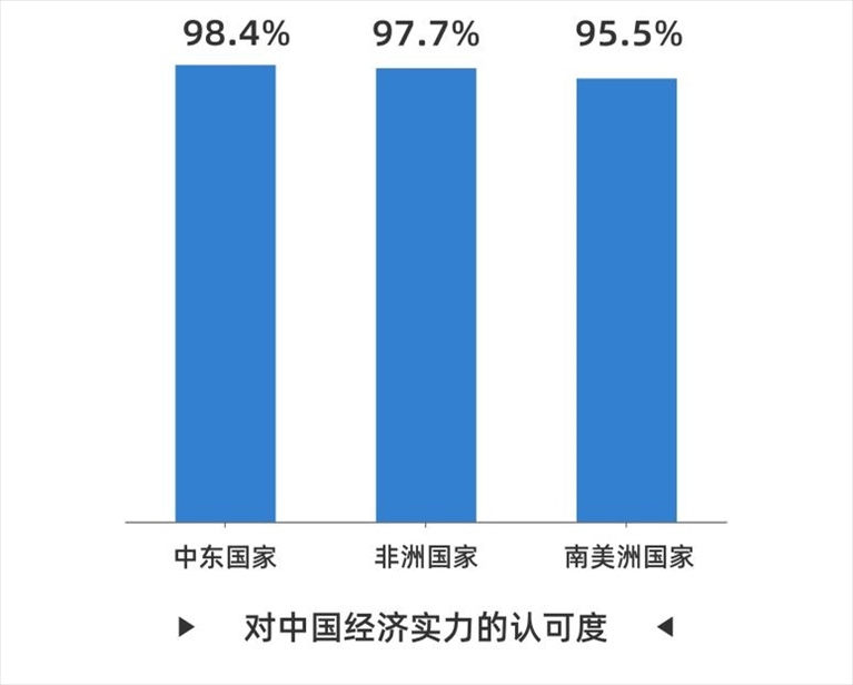 在經(jīng)濟表現(xiàn)方面,92.3%的受訪者稱贊中國經(jīng)濟實力強勁,這一調查結果與去年基本持平。其中,中東國家受訪者的認可度達到98.4%,非洲國家和南美洲國家受訪者的認同度分別為97.7%和95.5%。