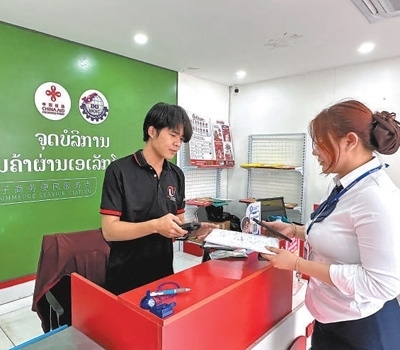 在老撾首都萬象市一處便民服務點,當?shù)鼐用袷杖≡陔娚唐脚_選購的商品快遞。本報記者 孫廣勇攝