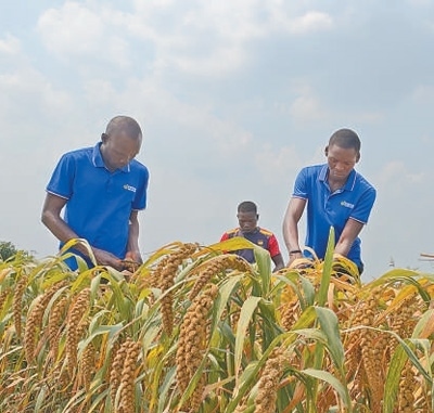 在中國—烏干達農業(yè)合作產業(yè)園的試驗田里,當?shù)毓と苏谑斋@中國狐尾小米。龍文靖攝