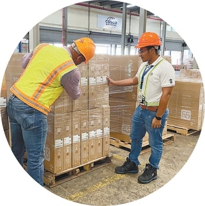 “海運+海外倉”是中遠海運探索出的“一站式”全程綜合物流服務模式,集海運、倉儲、報關等服務于一體。圖為在巴拿馬科隆自由貿易區(qū)內的中遠海運海外倉,工作人員對抵達的貨物進行質檢??逅埂ぐ嗟夏釘z