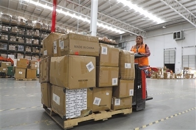 美獅集團墨西哥州海外倉內,一名員工從傳送帶取下貨物放到拖車上,準備移動至智能上架區(qū)入庫。本報墨西哥分社 埃內斯托·多明戈斯攝