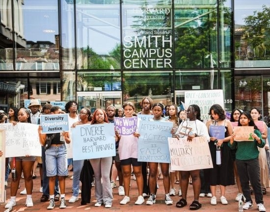 2023年7月1日,在美國(guó)馬薩諸塞州劍橋,人們手持標(biāo)語(yǔ)在哈佛大學(xué)校園舉行游行,抗議美國(guó)聯(lián)邦最高法院做出的招生政策判決。新華社發(fā)(朱子于攝)