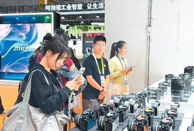 觀眾在進(jìn)博會(huì)尼康相機(jī)展臺(tái)參觀。本報(bào)記者 高 喬攝