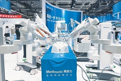 在進(jìn)博會(huì)醫(yī)療器械及醫(yī)藥保健館,美敦力展示的Hugo RAS機(jī)器人輔助手術(shù)系統(tǒng)。本報(bào)記者 高 喬攝