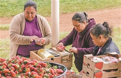 中國三峽巴西公司在位于巴西南部格利保吉水電站周邊開展創(chuàng)收創(chuàng)業(yè)試點項目。圖為當(dāng)?shù)剞r(nóng)戶正在分裝草莓。納塔利婭·弗洛爾攝