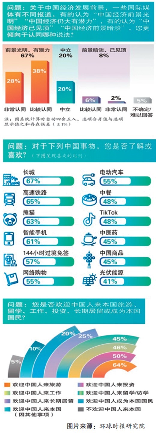 本次調(diào)查還列舉了10余項(xiàng)有代表性的中國(guó)事物,并逐一向國(guó)外民眾詢(xún)問(wèn)喜愛(ài)與否。其中,長(zhǎng)城(67%)、高鐵(65%)、熊貓(63%)、智能手機(jī)(61%)的獲喜愛(ài)比例超過(guò)六成,過(guò)境免簽(57%)、電動(dòng)汽車(chē)(55%)和網(wǎng)絡(luò)購(gòu)物(55%)的獲喜愛(ài)比例超過(guò)半數(shù),中餐(48%)和TikTok(48%)的獲喜愛(ài)比例接近半數(shù)。