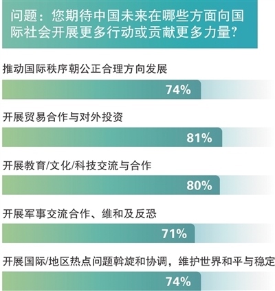近七成國外受訪民眾期待中國未來更多參與國際事務(wù)或發(fā)揮更大作用。近九成支持中國在有關(guān)國際機(jī)構(gòu)、機(jī)制或平臺(tái)中發(fā)揮更大作用。八成多期待中國在經(jīng)貿(mào)合作與教科文兩個(gè)領(lǐng)域作出更多國際貢獻(xiàn);七成多期待中國在國際秩序建設(shè)、維護(hù)和平穩(wěn)定方面發(fā)揮更大作用。國外受訪民眾對“構(gòu)建人類命運(yùn)共同體”的認(rèn)知率達(dá)66%,對三大全球倡議和共建“一帶一路”倡議的認(rèn)知率為七成左右。對“平等有序的世界多極化”和“普惠包容的經(jīng)濟(jì)全球化”兩項(xiàng)主張,國外受訪民眾有超過半數(shù)認(rèn)同。