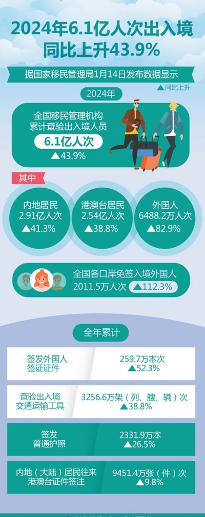 在2024年中國國際傳播年度熱詞榜上,“中國游”一詞名列前十。中國全面放寬優(yōu)化免簽政策,推出一系列便利外國人來華政策舉措,“中國游”成為越來越多外國游客的優(yōu)先選擇。中國國家移民管理局最新數(shù)據(jù)顯示,2024年,全國移民管理機(jī)構(gòu)累計(jì)查驗(yàn)出入境人員6.1億人次,同比上升43.9%;其中內(nèi)地居民2.91億人次、港澳臺居民2.54億人次、外國人6488.2萬人次,同比分別上升41.3%、38.8%、82.9%。全國各口岸免簽入境外國人2011.5萬人次,同比上升112.3%。說走就走的“中國游”打開了世界了解中國的新窗口、新通道,向全球展現(xiàn)真實(shí)、多元和活力滿滿的中國形象。