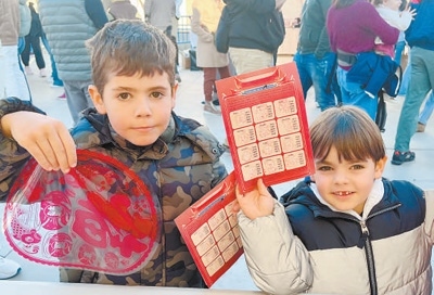 1月19日,在西班牙阿利坎特2025蛇年春節(jié)廟會上,小朋友們收集中國生肖印章并兌換新春福字窗花。