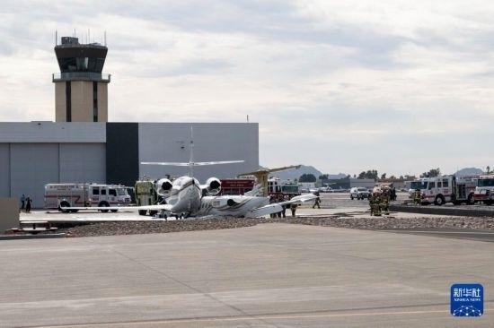 這張拍攝于2月10日的社交媒體照片顯示,消防員在美國亞利桑那州斯科茨代爾機(jī)場的飛機(jī)相撞現(xiàn)場工作。新華社/美聯(lián)