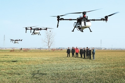 近日,安徽省亳州市蒙城縣樂(lè)土鎮(zhèn)屈廟村田間,農(nóng)機(jī)技術(shù)人員(左三)向飛手介紹植保無(wú)人機(jī)作業(yè)的安全要求及注意事項(xiàng)。