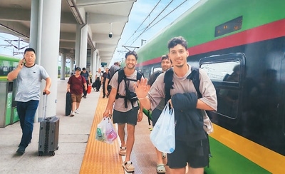 外國(guó)旅客乘坐中老鐵路跨境旅客列車抵達(dá)云南磨憨站。