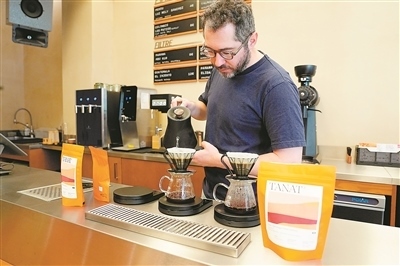 法國(guó)知名精品咖啡烘焙品牌TANAT今年推出兩款產(chǎn)自云南保山紅龍莊園的小粒咖啡產(chǎn)品。該品牌首席烘焙師托馬·克萊芒表示,所選的云南咖啡豆口感柔和細(xì)膩,兼具豐富的層次與地域特色。圖為該品牌位于巴黎的一家門店內(nèi),咖啡師在沖泡云南咖啡。