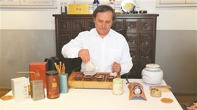 品茶已經(jīng)成為許多意大利人的日常生活習(xí)慣。意大利茶業(yè)與花草茶協(xié)會(huì)主席馬可·貝托納十分喜愛中國(guó)茶,并收藏有正山小種、普洱茶等多種中國(guó)名茶。圖為馬可·貝托納在展示茶藝。