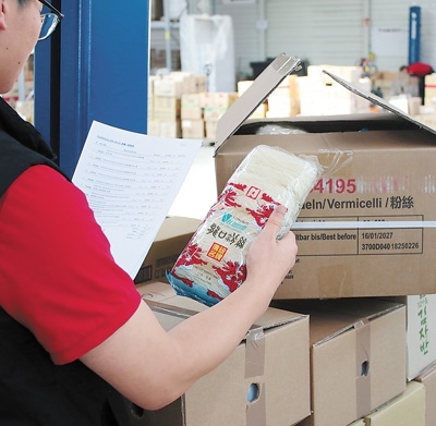圖為東方超市員工在清點(diǎn)剛運(yùn)抵貨運(yùn)中心的龍口粉絲。作為中國(guó)最早與歐盟互認(rèn)的地理標(biāo)志產(chǎn)品之一,龍口粉絲一直深受德國(guó)顧客的青睞。