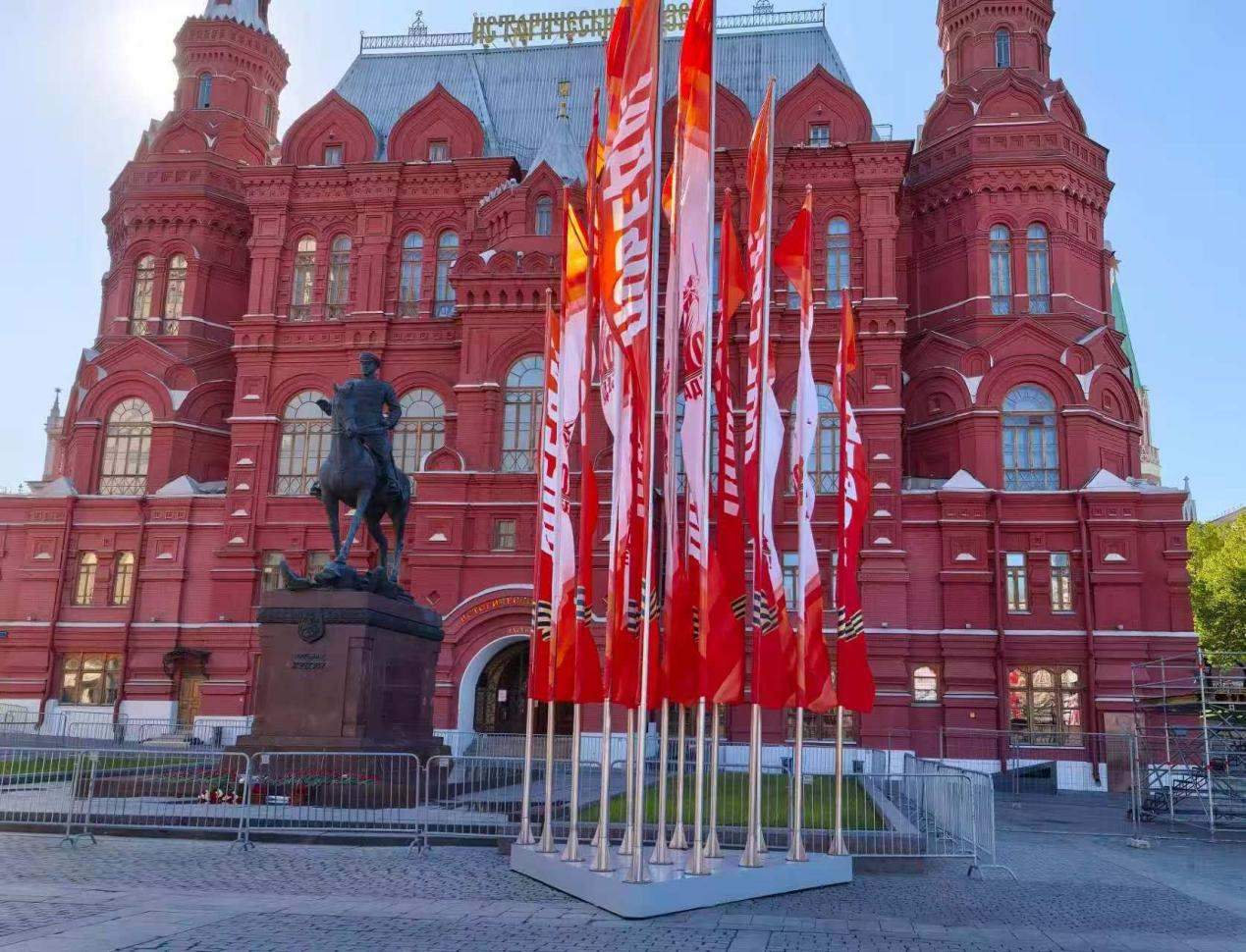 當(dāng)?shù)貢r(shí)間5月6日,俄羅斯國家歷史博物館前擺放紀(jì)念蘇聯(lián)偉大衛(wèi)國戰(zhàn)爭(zhēng)勝利80周年慶典旗幟。 鄺西曦 攝