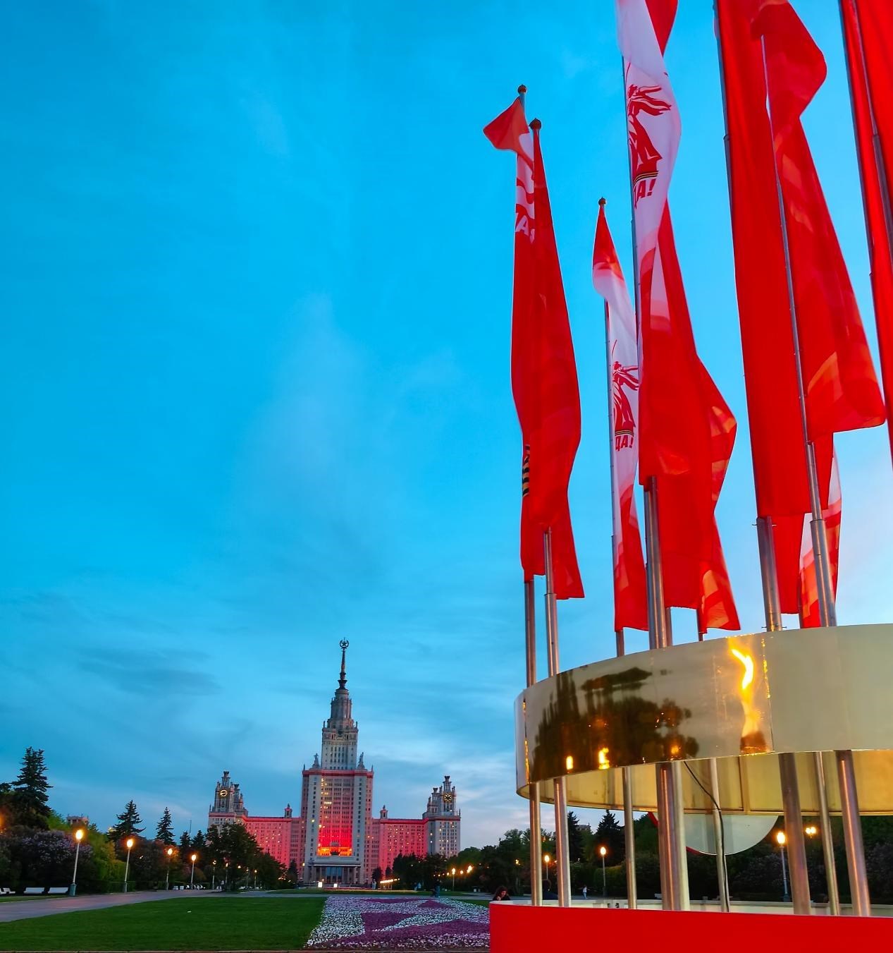 當(dāng)?shù)貢r(shí)間5月6日,莫斯科麻雀山,紀(jì)念蘇聯(lián)偉大衛(wèi)國戰(zhàn)爭(zhēng)勝利80周年慶典的旗幟飄揚(yáng),與莫斯科國立大學(xué)主樓的燈火遙相輝映。 鄺西曦 攝