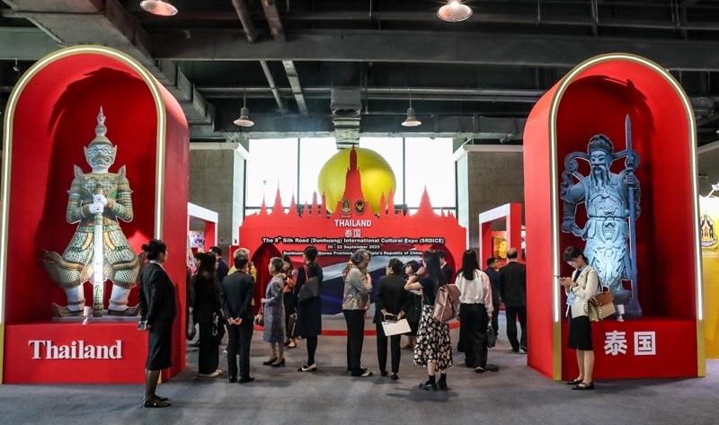 9月21日,在第八屆絲綢之路(敦煌)國(guó)際文化博覽會(huì)上,與會(huì)嘉賓參觀主賓國(guó)泰國(guó)展廳。