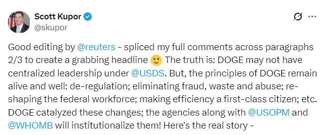 庫(kù)珀表示,“政府效率部”或許不再會(huì)有“集中化的領(lǐng)導(dǎo)”,但其工作準(zhǔn)則將繼續(xù)保留:減少章程架構(gòu);減少欺詐、浪費(fèi)和濫用;重塑聯(lián)邦人力結(jié)構(gòu);將效率放在首位等等?!罢什俊贝邉?dòng)了相關(guān)變革,美國(guó)人事管理局、白宮管理和預(yù)算辦公室一起將其制度化,“這才是真相”。