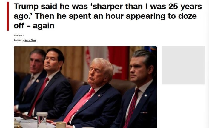 美國(guó)有線(xiàn)電視新聞網(wǎng)(CNN)注意到,當(dāng)美國(guó)商務(wù)部長(zhǎng)盧特尼克談及貿(mào)易戰(zhàn)時(shí),特朗普“似乎難以睜開(kāi)眼睛”。在美國(guó)教育部長(zhǎng)麥克馬洪和美國(guó)衛(wèi)生與公眾服務(wù)部長(zhǎng)小羅伯特·肯尼迪發(fā)言時(shí),特朗普“似乎僵住了,閉著眼睛,每次持續(xù)10到15秒,然后才轉(zhuǎn)動(dòng)眼球或點(diǎn)頭”。