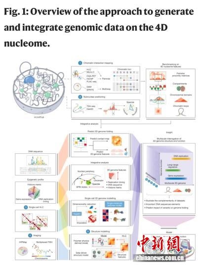 該論文介紹,人類染色體的三維組織結(jié)構(gòu),對(duì)于協(xié)調(diào)遺傳物質(zhì)調(diào)控生物反應(yīng)過(guò)程起到重要作用。DNA纏繞組蛋白形成名為染色質(zhì)的復(fù)合體,存儲(chǔ)在細(xì)胞核內(nèi)。大量染色質(zhì)位點(diǎn)可通過(guò)生物化學(xué)修飾來(lái)調(diào)控基因表達(dá)。繪制這一三維結(jié)構(gòu)及其如何經(jīng)時(shí)(第四維度)改變的工作,被稱為4D核組學(xué)。