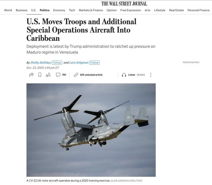 中新網(wǎng)12月24日電 據(jù)美國《華爾街日報》報道,本周美國已向加勒比地區(qū)調遣了大批特種作戰(zhàn)飛機、美軍人員及裝備,為華盛頓在委內瑞拉采取軍事行動提供了更多選擇。