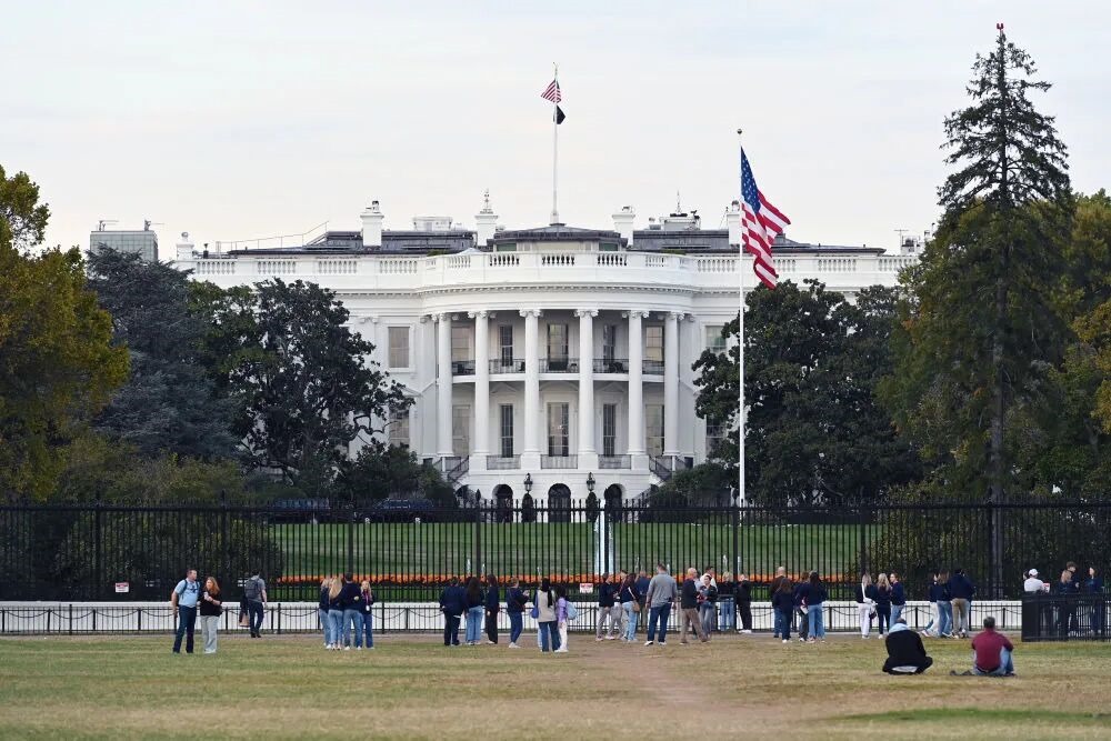 2025年10月21日,在美國(guó)華盛頓,人們?cè)诎讓m前休閑。新華社記者李睿攝