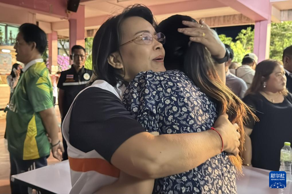 2月11日,兩名女子在泰國(guó)宋卡府合艾縣發(fā)生校園槍擊案的學(xué)校互相擁抱。新華社發(fā)