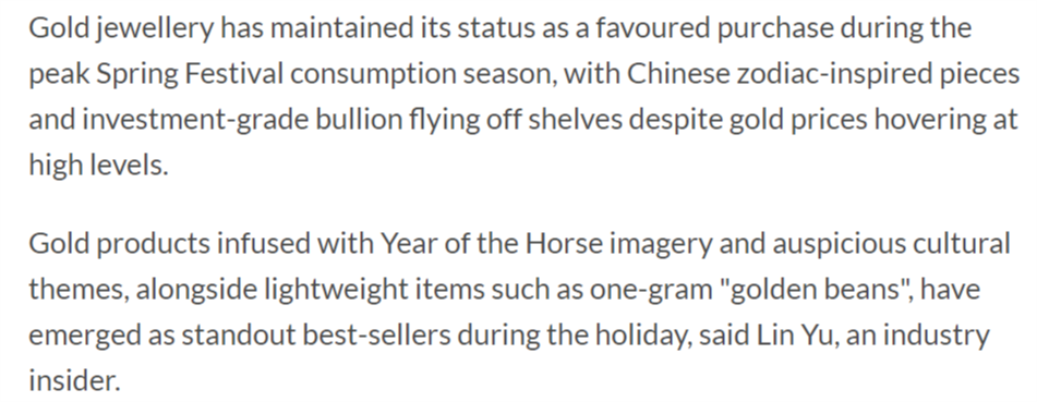 報(bào)道還稱,黃金珠寶在春節(jié)消費(fèi)旺季持續(xù)保持熱門購(gòu)買地位,盡管金價(jià)處于高位,但生肖主題設(shè)計(jì)的黃金飾品和投資級(jí)金條依然暢銷。報(bào)道援引業(yè)內(nèi)人士的話稱,融入馬年元素和吉祥文化主題的黃金產(chǎn)品,以及如一克“金豆”等質(zhì)量較輕的產(chǎn)品,在節(jié)日期間成為最暢銷的品類。