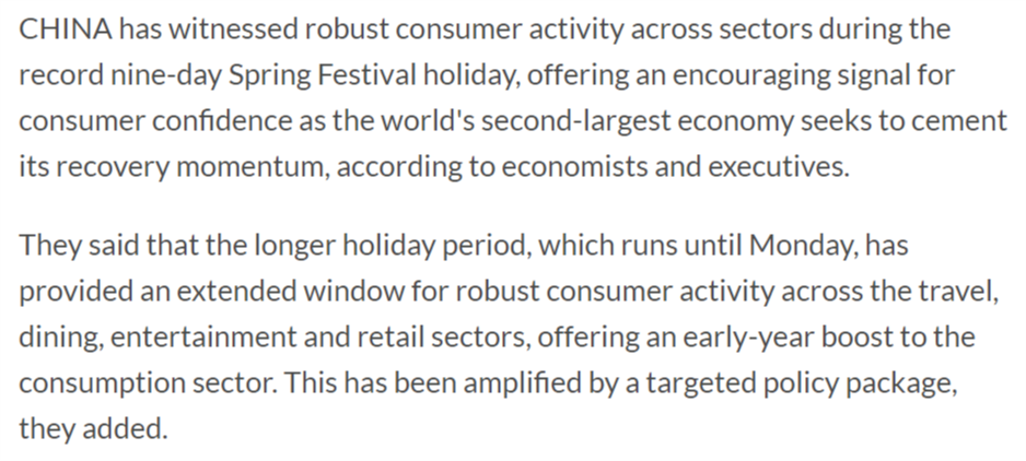 報(bào)道援引經(jīng)濟(jì)學(xué)家和企業(yè)界人士的話指出,這一持續(xù)至周一(23日)的假期,為旅游、餐飲、娛樂(lè)和零售等行業(yè)的強(qiáng)勁消費(fèi)活動(dòng)提供了更長(zhǎng)時(shí)間窗口,為消費(fèi)領(lǐng)域帶來(lái)了年初提振。