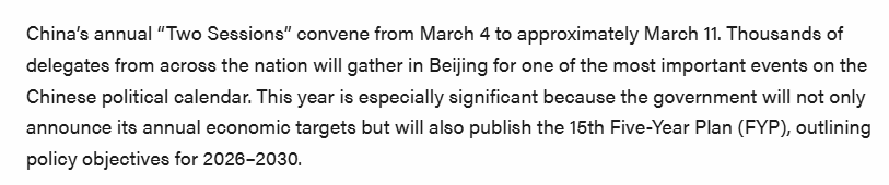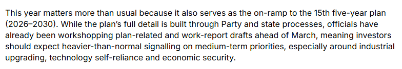 文章說,今年的兩會(huì)尤為關(guān)鍵,將為第十五個(gè)五年規(guī)劃(2026-2030年)奠定基礎(chǔ)。投資者應(yīng)關(guān)注比往年更明確的政策信號(hào),特別是在產(chǎn)業(yè)升級(jí)、科技自主和經(jīng)濟(jì)安全等領(lǐng)域。