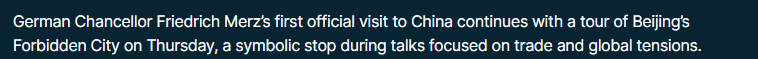 歐洲新聞電視臺26日報道稱,在經(jīng)濟緊張局勢加劇的背景下,德國正努力尋求更平衡的貿(mào)易關(guān)系。默茨此次訪問期間的一個具有象征意義的環(huán)節(jié)就是參觀故宮。報道稱,默茨表示,德國乃至歐洲希望與中國建立一種平衡且可靠的伙伴關(guān)系。