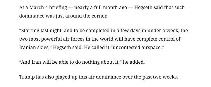早在3月4日簡報會上,赫格塞思就曾宣稱,“從昨晚起,并在未來數(shù)日內(nèi)、總計不到一周的時間,全球最強大的兩支空軍將實現(xiàn)對伊朗領(lǐng)空的全面控制。” 他將這一局面描述為“無對抗領(lǐng)空”,并稱“伊朗對此將毫無辦法”。過去兩周,特朗普同樣在大力渲染這一空中優(yōu)勢。