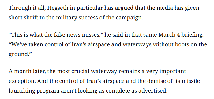 文章最后說,在赫格塞思說出這番話的一個月后,那條最關(guān)鍵的航道仍是一個“重大例外”。至于所謂“已完全掌控伊朗領(lǐng)空以及摧毀伊朗導(dǎo)彈發(fā)射能力”的說法,現(xiàn)實情況顯然與當初的宣揚大相徑庭。