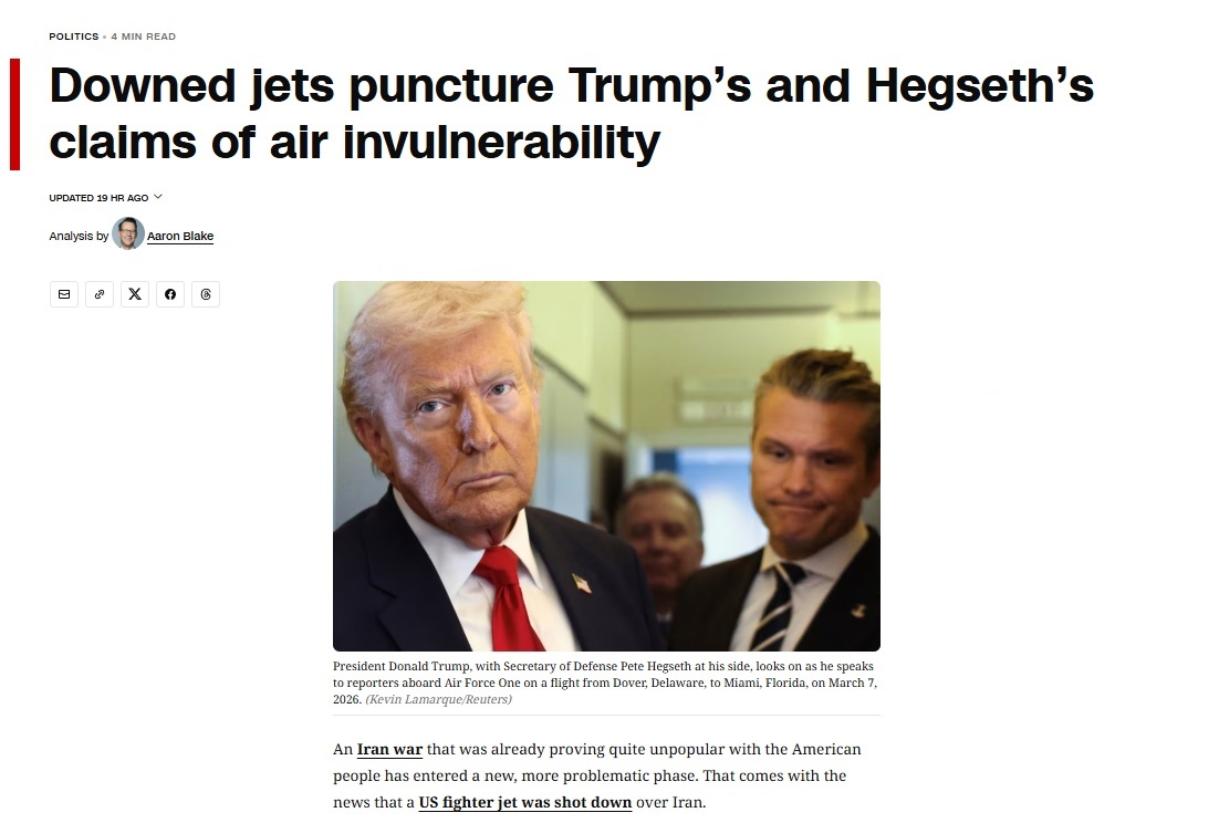 文章稱,美國總統(tǒng)特朗普與國防部長赫格塞思此前曾表示,美國和以色列在伊朗上空擁有近乎不受限制的飛行自由。他們聲稱,伊朗方面根本不具備反制能力。